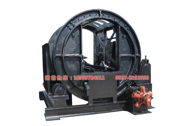 液壓圓形翻車機(又稱翻籠)是一種側面卸載的設備。它與前傾式翻車架相比,具有工作比較平穩,視需要可以設計為翻卸兩輛或兩輛以上的礦車,并能直接通過,待卸的列車也可以不必摘鉤,所以生產能力較大。