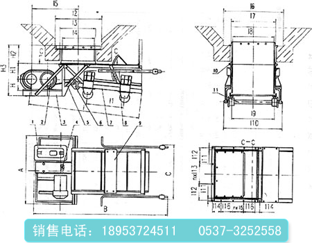 1、減速機 2、電動機 3、傳動平臺 4、聯軸器 5、H形架 6、連桿 7、給煤槽 8、閘門 9、機架 10、漏斗 11、托輥