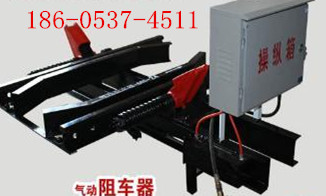 2、氣動(dòng)抱軌式阻車器:主要由電控箱或氣控箱(含空氣過濾裝置)、雙阻車器主體、位置傳感器(或遙控器)等組成。該裝置以固定風(fēng)源為動(dòng)力,氣缸為動(dòng)力執(zhí)行部件,通過氣缸的伸縮來實(shí)現(xiàn)擋爪的開與關(guān)。