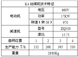 K4給煤機技術特征 電動機 電壓 660V 功率 17KW 轉速(轉/分) 970 減速機 型號 ZQ500 速比 15.75 曲柄位置 1 2 3 4 生產能力T/h 132 268 395 530 重量 2880Kg 保證每一臺給煤機正常連續工作,才能確保 原煤的暢通運輸,否則每一臺給煤機的故障,都不同程度的影響生產產量。
