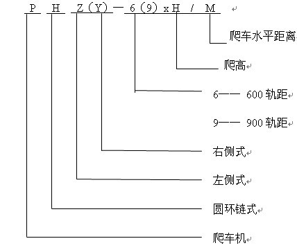 液壓鏈式爬車機用于600軌距1t、1.5t及900軌距1.5t、3t礦車向上爬高,根據爬高不同共有14種型號,每種又根據傳動裝置布置方式不同分為左側式與右側式。